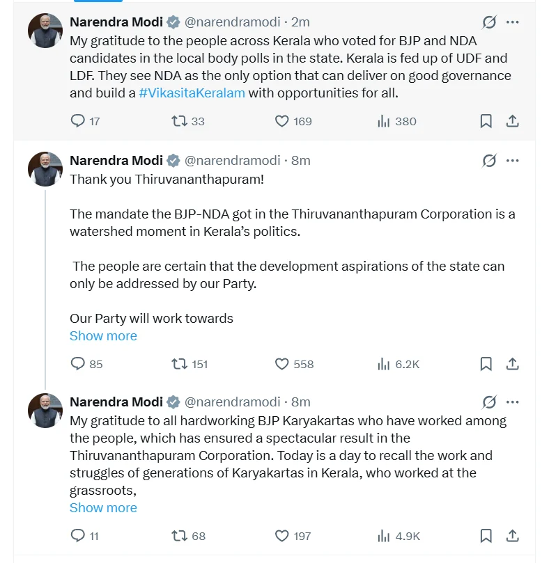 केरल में BJP-NDA को ऐतिहासिक जनादेश, PM मोदी बोले— ‘विकसित केरल’ के लिए जनता ने NDA पर जताया भरोसा नई दिल्ली/तिरुवनंतपुरम: प्रधानमंत्री नरेंद्र मोदी ने केरल के स्थानीय निकाय चुनावों…