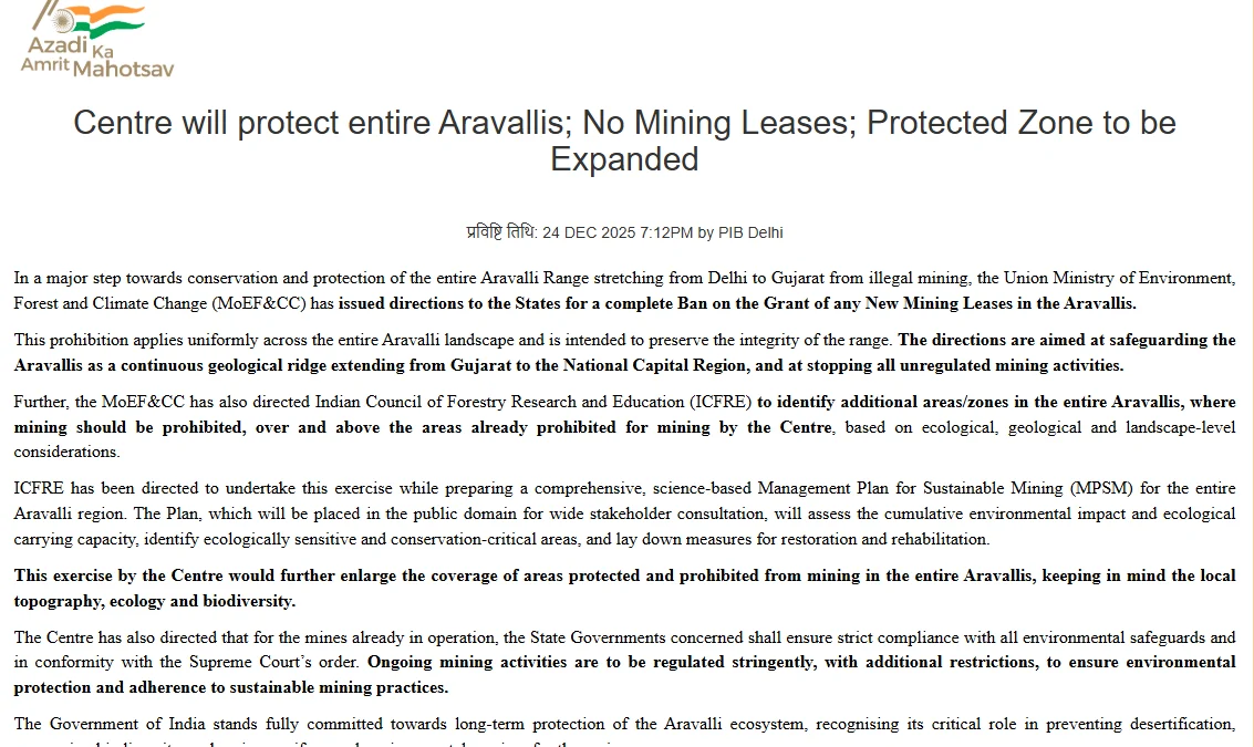 सरकार ने यह कदम अरावली क्षेत्र में बढ़ती अवैध खनन गतिविधियों और पर्यावरणीय क्षति को देखते हुए उठाया है। मंत्रालय ने सभी संबंधित राज्यों को निर्देश जारी करते हुए कहा है कि पूरे अरावली लैंडस्केप में नई माइनिंग पर पूर्ण प्रतिबंध लागू होगा।