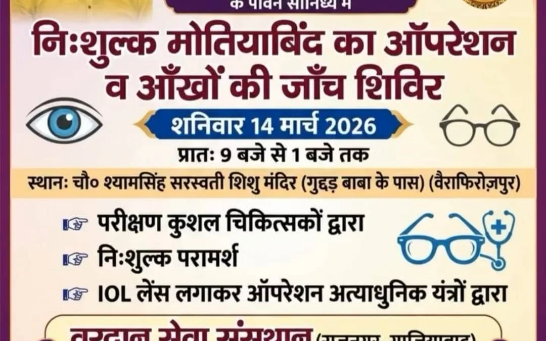 स्याना (बुलंदशहर)। बुलंदशहर जिले के स्याना क्षेत्र के गांव वैरा फिरोजपुर में 14 मार्च 2026 को एक विशाल निःशुल्क नेत्र जांच एवं मोतियाबिंद ऑपरेशन शिविर आयोजित किया जा रहा है। इस फ्री आई कैंप में आधुनिक मशीनों की मदद से आंखों की जांच की जाएगी और जरूरतमंद मरीजों का IOL लेंस के साथ मुफ्त मोतियाबिंद ऑपरेशन भी किया जाएगा।
