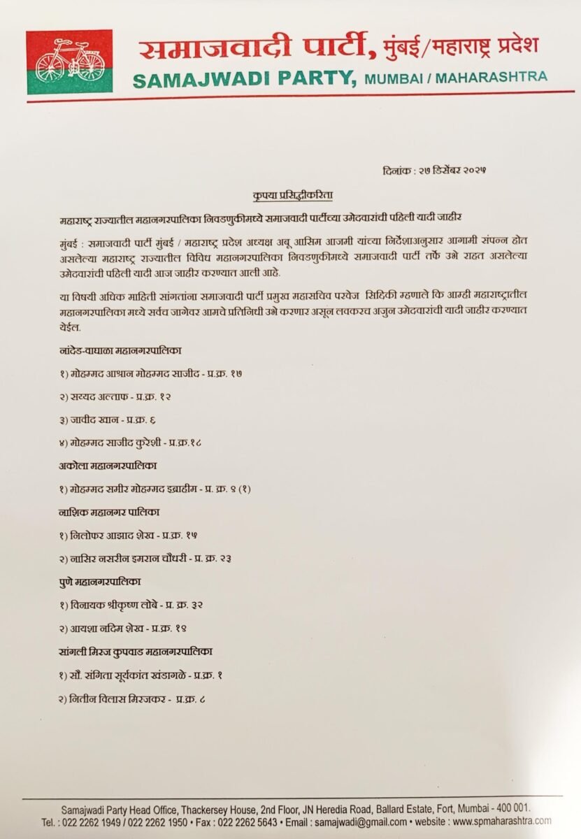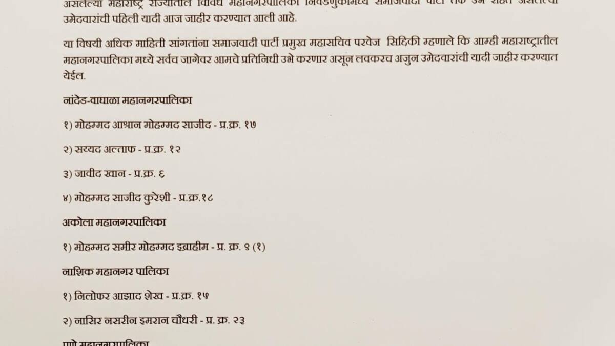 देखें वीडियो Share on:WhatsAppPost navigationमहाराष्ट्र नगर निकाय चुनाव से पहले सपा ने उम्मीदवार सूची जारी; इन शहरों में उतारे प्रत्याशी