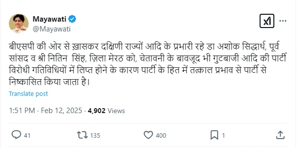 लखनऊ: बहुजन समाज पार्टी (BSP) अध्यक्ष मायावती ने बड़ी कार्रवाई करते हुए डॉ. अशोक सिद्धार्थ और नितिन सिंह को पार्टी से निष्कासित कर दिया है। दोनों पर पार्टी विरोधी गतिविधियों…