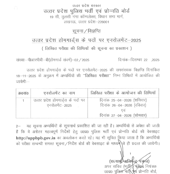 उत्तर प्रदेश पुलिस भर्ती एवं प्रोन्नति बोर्ड (UPPRPB) ने UP Police Home Guard Recruitment 2025 से जुड़ी बड़ी जानकारी जारी कर दी है। बोर्ड की ओर से लिखित परीक्षा (Written Exam) की तारीखों को लेकर आधिकारिक सूचना प्रकाशित कर दी गई है, जिससे लाखों अभ्यर्थियों का इंतजार अब खत्म हो गया है।